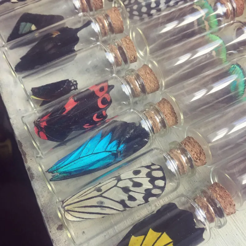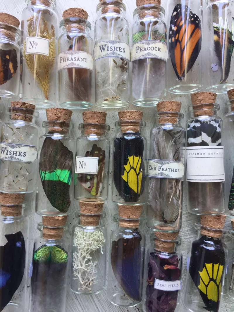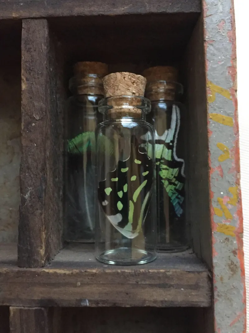 3 x glass bottles with cork stoppers. Each bottle will contain a different treasure. One will be a butterfly wing. (Although tropical butterflies, these are from an exotic butterfly farm here in NZ. They have lived their lives - many of the wings have imperfections - the way it should be!).